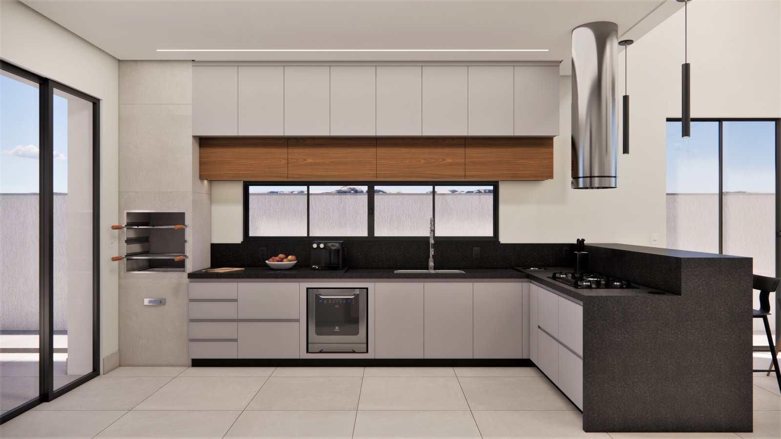 madeira acolhedora e o requinte da pedra preto São Gabriel. O resultado é um projeto que